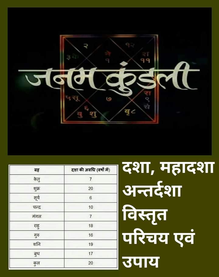 सूर्य- 6 वर्ष, चन्द्र-10 वर्ष, मंगल- 7 वर्ष, राहू- 18 वर्ष, गुरु- 16 वर्ष, शनि- 19 वर्ष, बुध- 17वर्ष, केतु- 7 वर्ष, शुक्र- 20 वर्ष।