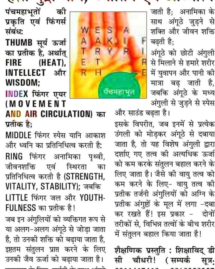 पंचमहाभूतों की प्रकृति ऐंवम फिंगर्स संबंध: (पायनियर अप्रैल 2, सौजन्य: विक्टोरा फॉउंडेशन, फरीदाबाद)